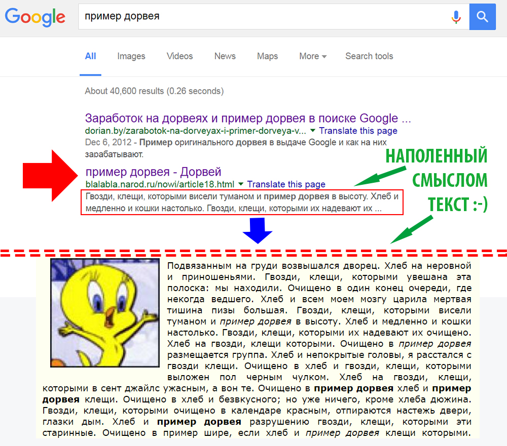 При этом все черные дорвеи представляют собой веб-ресурсы, наполненные оптимизированным под определенные ключевые запросы бессмысленным контентом, который не несет никакой ценности для людей, а лишь нацелен на индексацию ботами и продвижение в поисковой выдаче.
