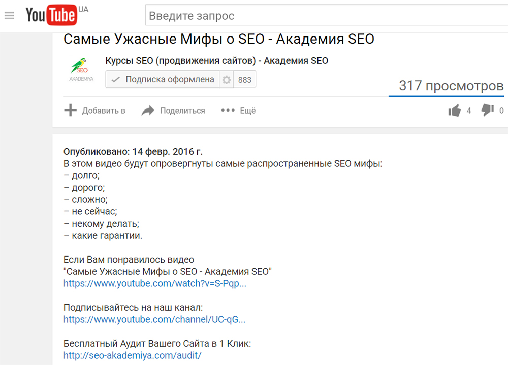 - употребить как минимум три ссылки: на это же видео, на канал и на продвигаемый веб-ресурс или одну из размещенных на его страницах статей;