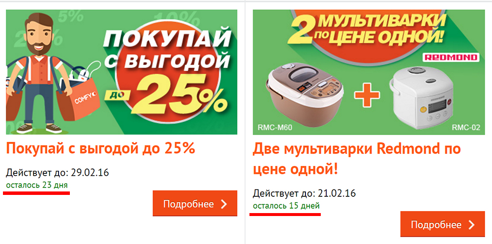 Особливий ефект іноді дає тригер на сайті у вигляді таймера зворотного відліку до кінця акції. В цьому випадку страх не встигнути купити щось за вигідною ціною може взяти верх над бажанням подумати про доцільність цієї покупки.
