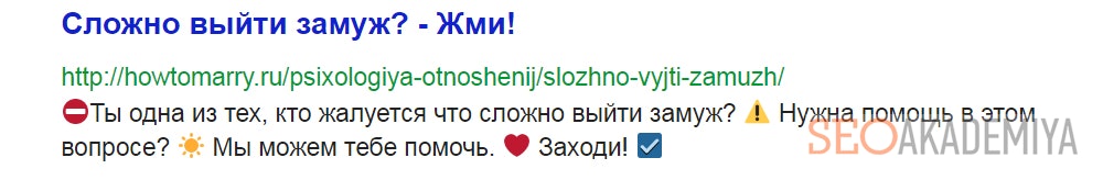- Використовувати спеціальні символи в сніппеті сторінки для залучення уваги. Цей же пункт відноситься до Google, так як в Яндекс спец.сімволи практично не відображаються в результатах видачі