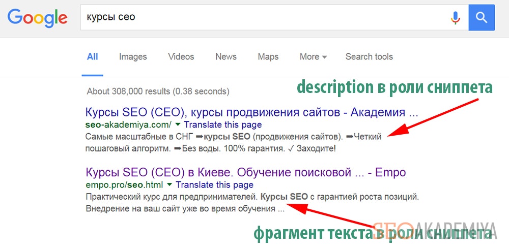 Багато хто помилково вважають, що метатег description - це і є сніппет сторінки. Але це не зовсім так. Так, пошуковики можуть використовувати вміст метатега як сніппету у видачі. Але якщо вони знаходять більш релевантний фрагмент тексту, що містить пошуковий запит, то використовують вже його. До того ж description – не єдина його складова.